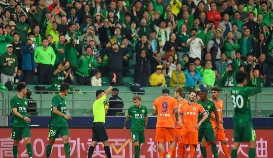 上赛季国安与泰山的两回合比赛,剧情跌宕得如同电影。 首先是在北京国安的主场,那场比赛的进程超出了所有人的预期。 当值主裁判唐顺齐和视频助理裁判麦麦提江在比赛中做出了几次关键判罚,其中最直接的影响是山东泰山队有两名球员被红牌罚下场。 在长时间以多打少的局面下,北京国安的进攻彻底打开,最终将比分锁定在6比1。 这是一场让国安球迷酣畅淋漓的大胜,工体现场的气氛达到了顶点。