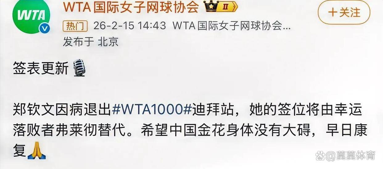 网球联赛,ATP赛程,WTA积分,网球直播入口,网球世界排名,四大满贯赛/实时更新全球网球联赛2025赛程、比分、排名及直播,全面覆盖ATP男子联赛、WTA女子赛事、四大满贯及国内网球比赛,为中文网球迷提供权威资讯与竞猜预测支持。就在2月16日凌晨,中国网球金花传来揪心消息——郑钦文紧急退出WTA迪拜站,距离她原定上场时间,只剩短短几小时。
