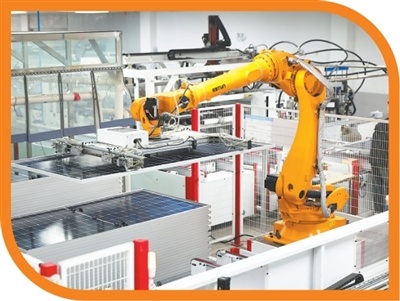江苏省淮安市洪泽区新源太阳能科技有限公司,工业机器人在生产太阳能光伏组件。殷 潮摄