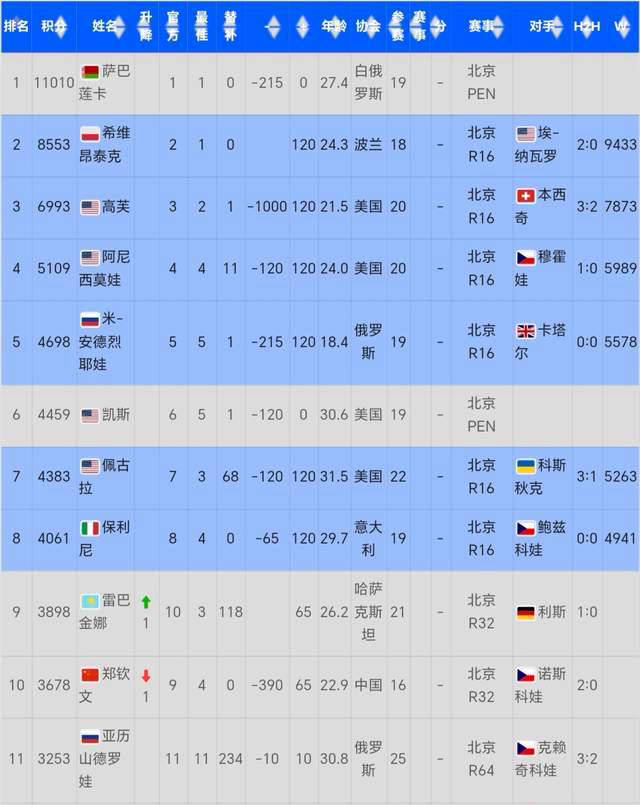 目前,郑钦文的积分为3678分,位列第十,与排名第九的莱巴金娜只相差220分。