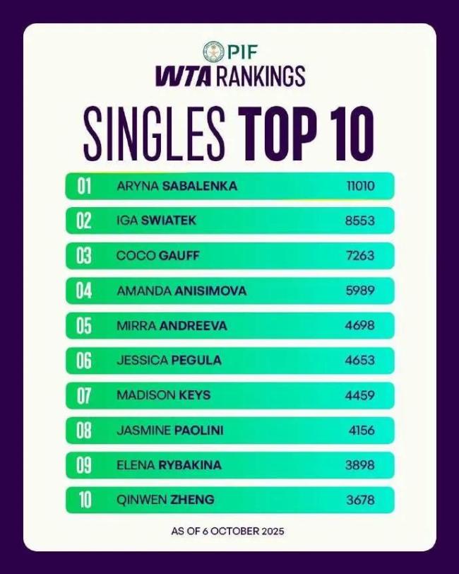 网球联赛,ATP赛程,WTA积分,网球直播入口,网球世界排名,四大满贯赛/实时更新全球网球联赛2025赛程、比分、排名及直播,全面覆盖ATP男子联赛、WTA女子赛事、四大满贯及国内网球比赛,为中文网球迷提供权威资讯与竞猜预测支持。10月7日,WTA国际女子网球协会更新了本周TOP20球员的排名和积分情况。中国选手郑钦文的排名下降至第10位,积分为3678分。