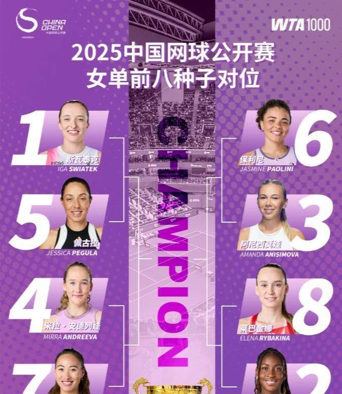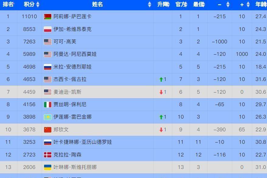 WTA世界前十随之洗牌。 萨巴伦卡和斯瓦泰克继续稳坐前二,高芙、阿尼西莫娃、米拉-安德烈娃、佩古拉、凯斯、鲍里妮、莱巴金娜和郑钦文分列三至十位,但具体顺序因中网结果出现微调。