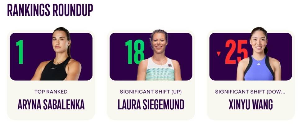 前10名其他选手变化情况不大,武网亚军佩古拉反超安德列娃,升至世界第5位。亚历山德罗娃超越郑钦文,上升到了世界第10的位置。前10具体排名:萨巴伦卡、斯瓦泰克、高芙、阿尼西莫娃、佩古拉、安德列娃、凯斯、鲍里妮、莱巴金娜、亚历山德罗娃。