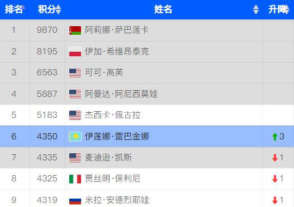 米拉-安德烈娃因未报名参加WTA500东京站比赛,没有增加积分,今年锁定的4319分为莱巴金娜反超提供了机会,只需在东京站打进四强,就能够完成超越。