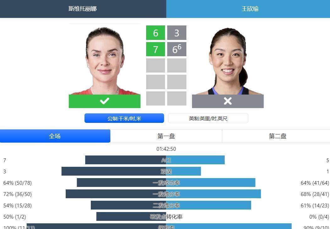 全场比赛技术统计显示,王欣瑜发出5个ACE球,仅有1次双误,一发得分率为65%。 斯维托丽娜的一发得分率略高于王欣瑜,达到75%。