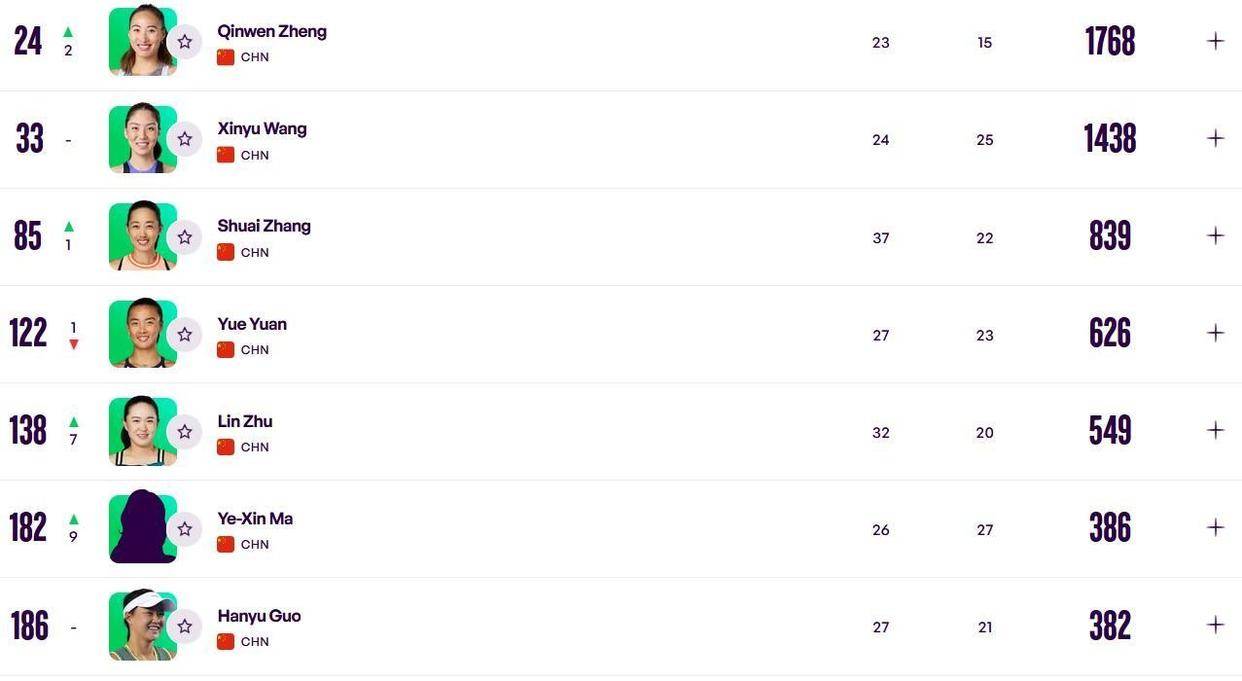 中国球迷最关心的,当然是金花郑钦文。 她的名字后面,跟着一个向上的箭头,排名从第26位升到了第24位,提升了两位。 这是她因伤休战133天后的复出首秀。 在多哈,她先是连赢两场,闯进了16强。