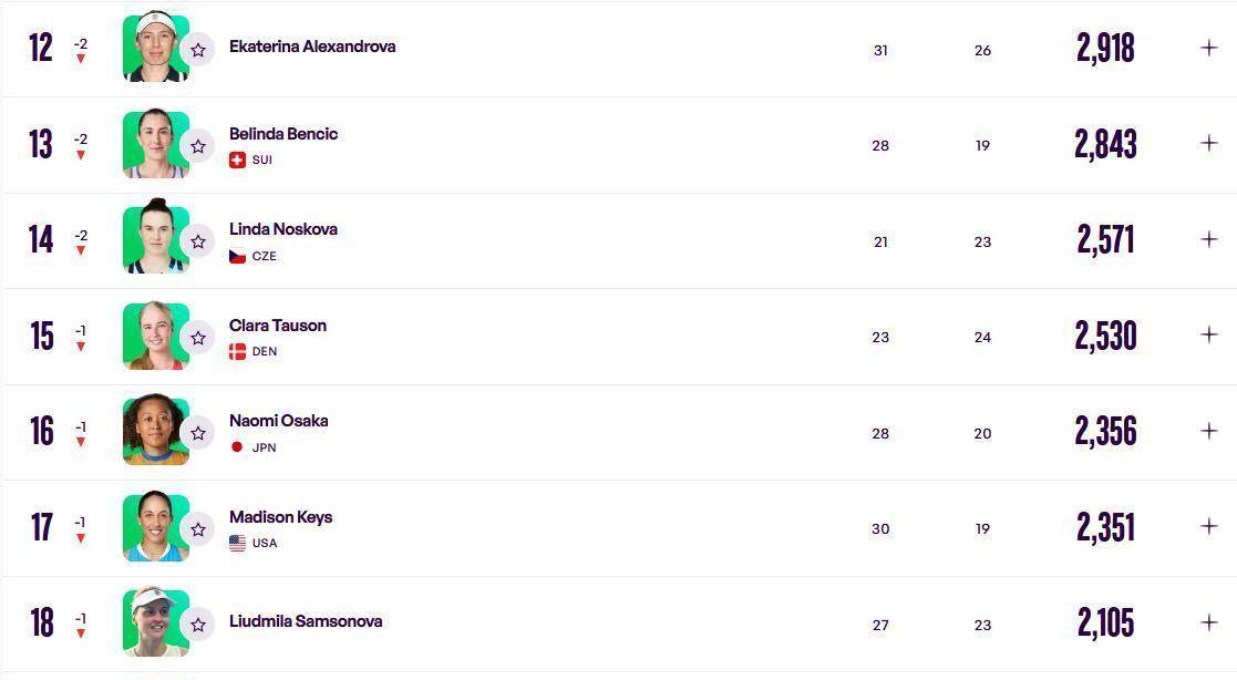 之前好不容易挤进前十的亚历山德洛娃,这周又跌了出来,掉到了第12位。 从第12到第19名的球员,这周全都挪了位置。