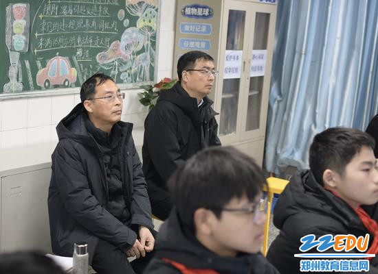 郑州七中教育集团党委书记王保军,金水区教育局党组成员、副局长曹鹏举进班听课。